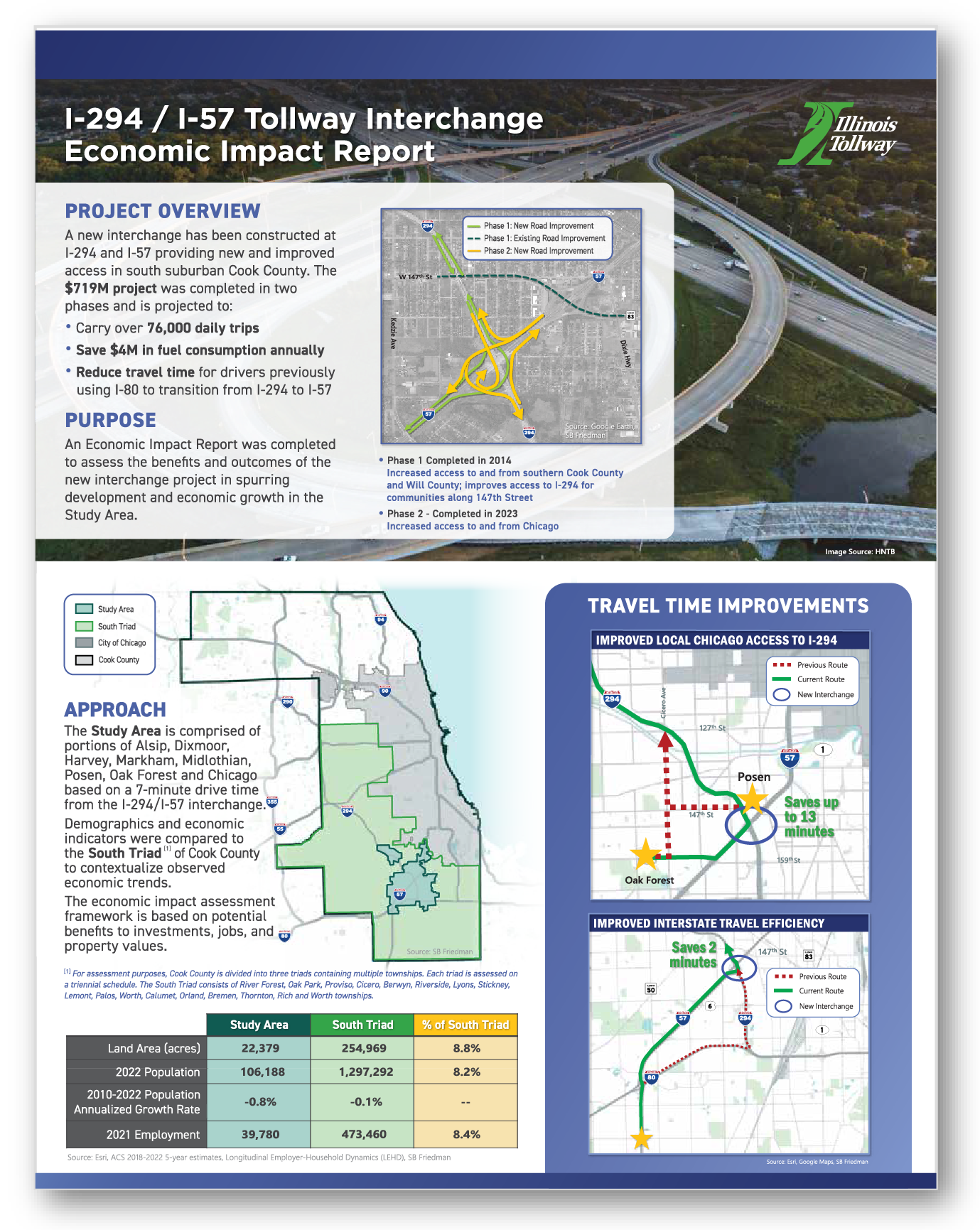 Mobility is more than just transportation – it is about promoting economic vitality, social equity and environmental responsibility. Through strategic investments, the Tollway improves access to employment centers and freight connections to industrial sites, helping attract new businesses while retaining existing ones. By aligning transportation investments to enhance access for underserved communities, the Tollway ensures that economic opportunity is inclusive and equitable. Maintaining reliable infrastructure and planning for future mobility creates long-term economic benefits, strengthens regional resilience and collectively supports growth and prosperity across the state.